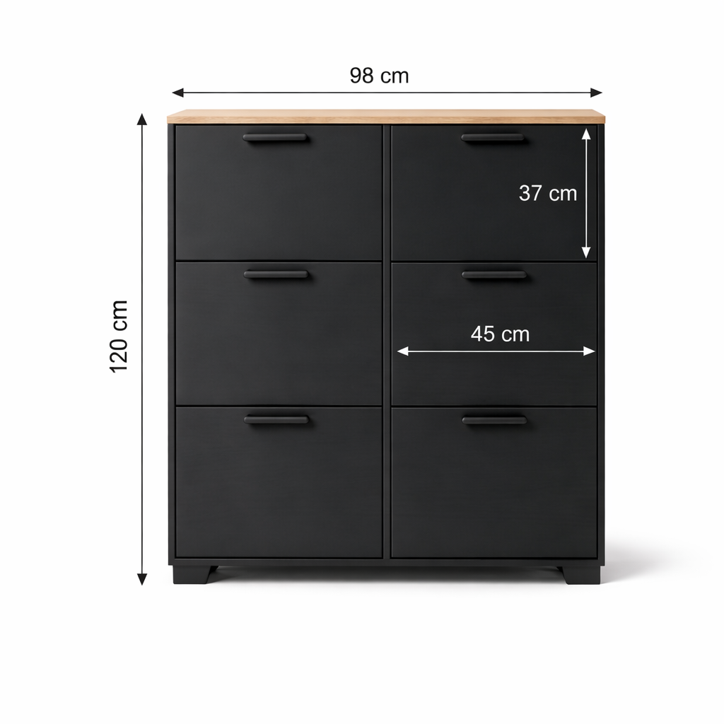 Son design industriel associe une finition noir mat à un plateau effet hêtre, ce qui en fait un meuble facile à intégrer dans différents espaces : entrée, couloir, chambre, dressing ou salon. Sa profondeur compacte permet d’optimiser l’espace sans encombrer la pièce.
